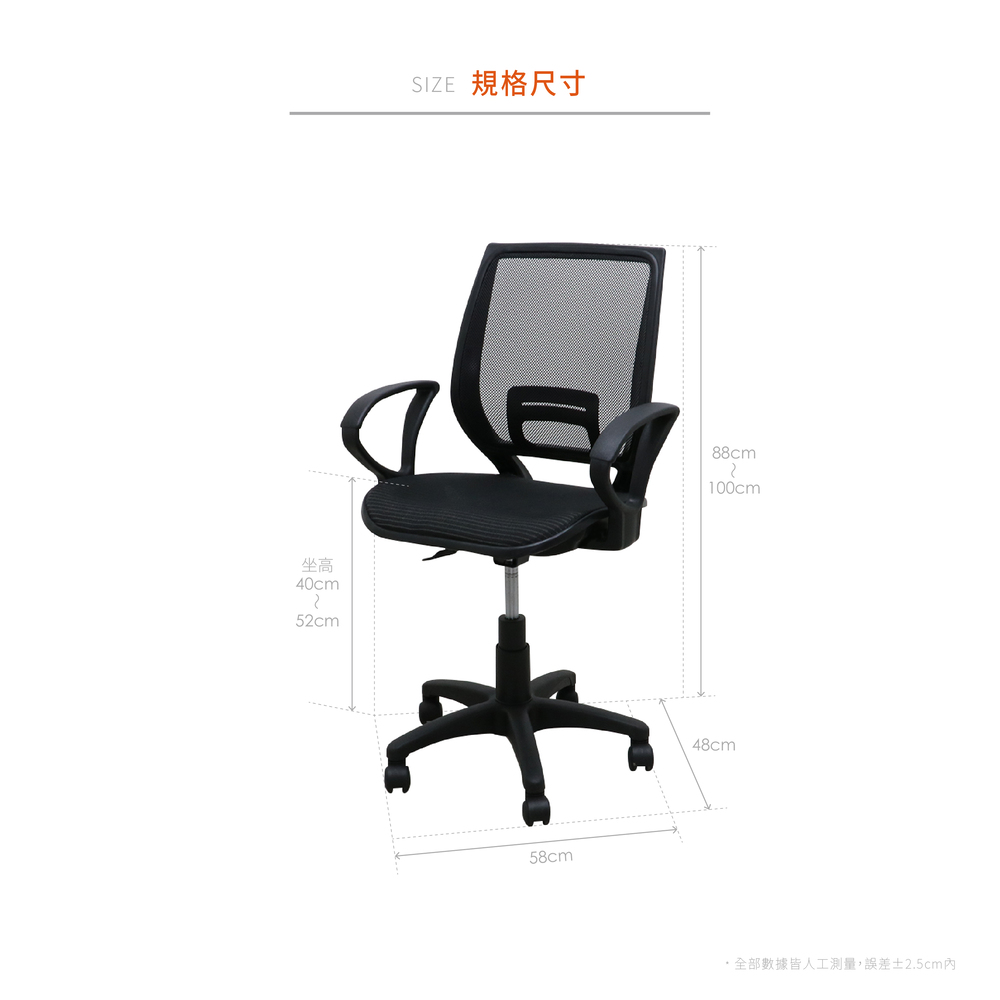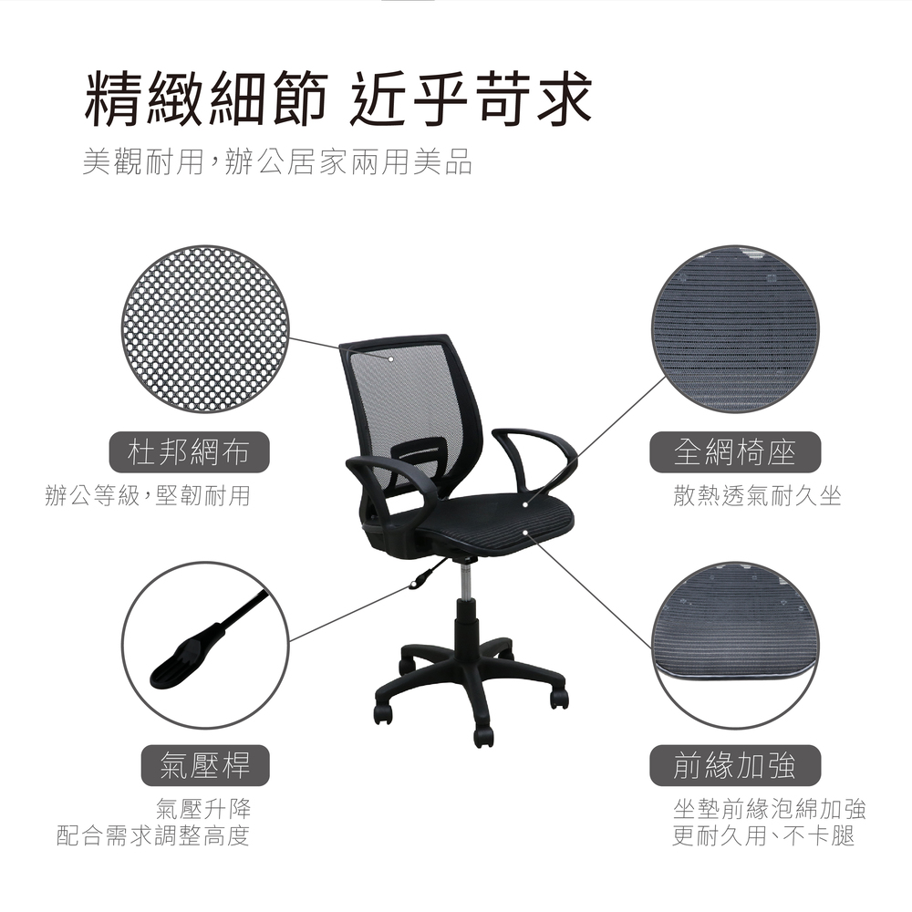 全網椅背,網布坐墊,透氣性佳。