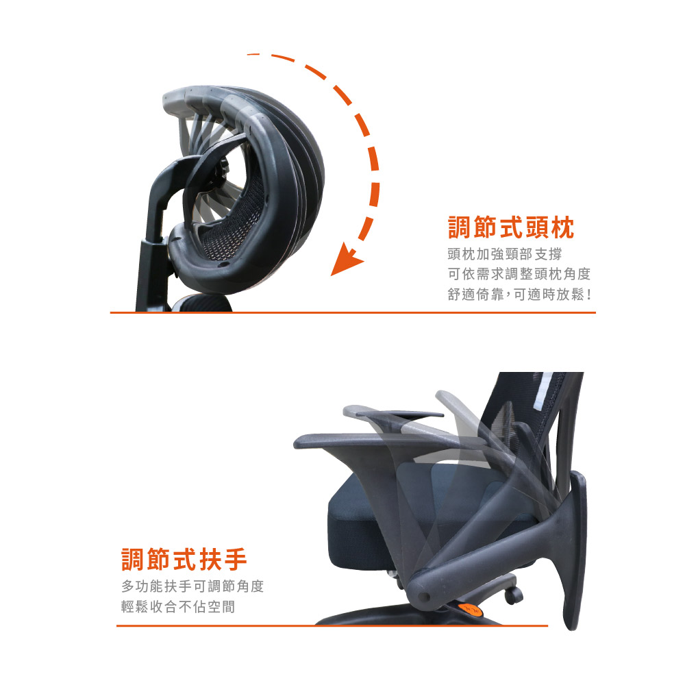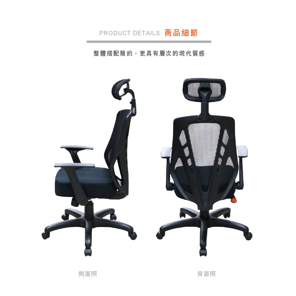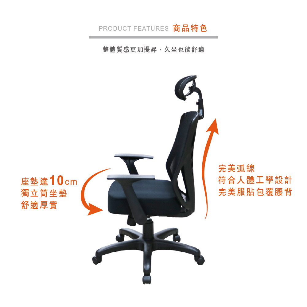 高韌性辦公用網背,獨立筒坐墊舒適厚實,頭枕加強頸部支撐,久坐不累。