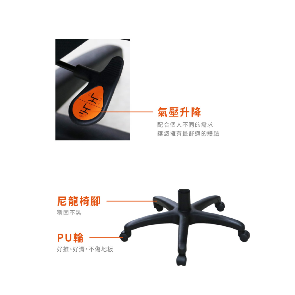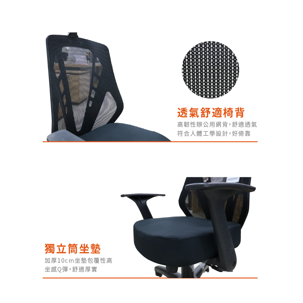 材質:獨立筒坐墊、辦公用高韌性網布、尼龍椅腳。
